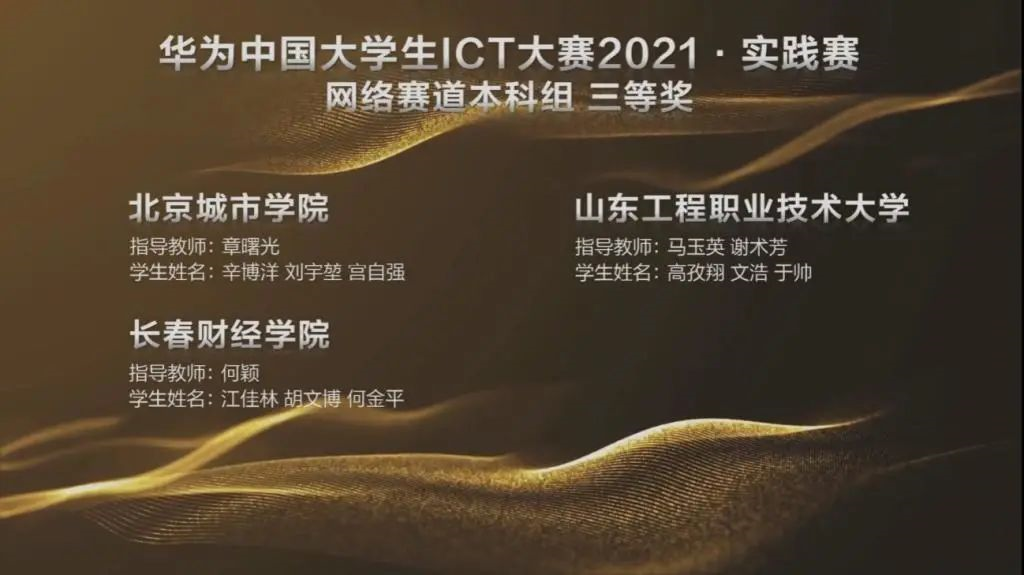 2021-12-2912月25日晚,華為技術有限公司隆重舉行“華為中國大學生ICT大賽2021全國總決賽”頒獎典禮,公布實踐賽和創新賽的獲獎名單,我校信息工程學院獲得全國總決賽三等獎。